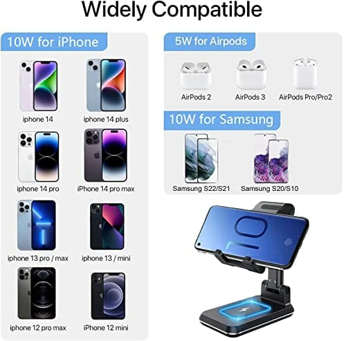• Szeroka kompatybilność: bezprzewodowa stacja ładująca jest kompatybilna z Samsung Galaxy Note10/ Note 10+/S20/S10/S10E/S10+/S9, iPhone 14/13/12/12 Pro/12 Pro Max/11/1 Pro/11 Pro Max/XS/MAX/XR, Airpods/Airpods Pro i wieloma innymi smartfonami, w tym LG, Nexus, Sony Xperia i więcej, aby umożliwić szybkie ładowanie. Wskazówka: Należy całkowicie przedłużyć dolne nóżki górnej ładowarki, jeśli korzystasz z dużego telefonu, takiego jak iPhone 12 Pro Max lub Samsung Note 20+.