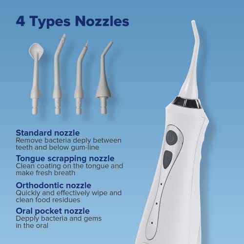 • ✅ 4 dysze: Posiada 4 dysze, 1x standardowe dysze, 1x środek do czyszczenia języka, 1x płytka nazębna, 1x przyzębia. Dzięki nim uzyskasz doskonałe czyszczenie we wszystkich szczelinach dzięki obracającym się dyszom o 360 stopni.