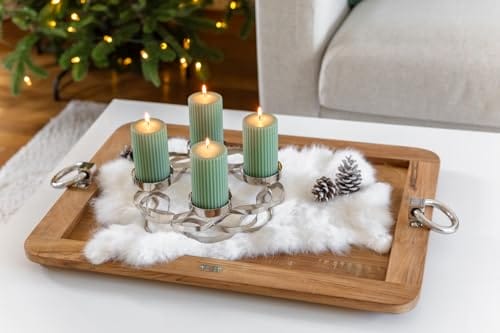 ✔ ŁATWA W: ✔ ŁATWA W UŻYCIU: cztery wbudowane podstawki na świece zapewniają bezpieczne spalanie świec. Wieniec jest wykonany ze stali nierdzewnej i dlatego jest wyjątkowo wytrzymały i ma szlachetny połysk. Wystarczy wilgotna ściereczka do pielęgnacji.