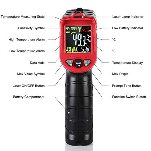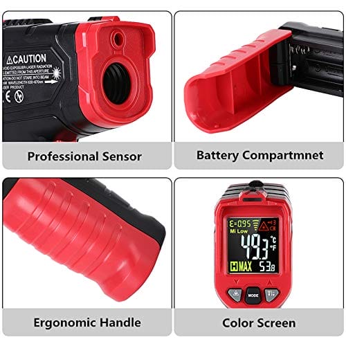 Termometr Podczerwony Cyfrowy IR Thermometr -50 ° C Do 680 ° C (-58 ℉ ~ 1056 ℉) Bezpośredni Kontakt Z Ekranem Lcd Funkcja Alarmowa Regulowane Poziom Emisji Czerwony I Czarny