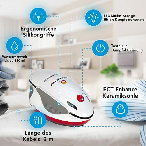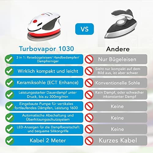 • ·⚡️ MOCNA TECHNOLOGIA – SKUTECZNOŚĆ 3 w 1 Ręczna parownica TurpoVapor 1030 ma 1600 W, maksymalnej mocy z 120 ml zbiornikiem na wodę o dużej po-jemności, który zapewnia ciągłą parę 250 g/min do 190 stopni Celsjusza pod ciśnieniem. Pionowe żelazko parowe jest wyposażone w niezwykle kompaktową i bardzo aktywną pompę parową z innowacyjnym wytwarzaniem pary