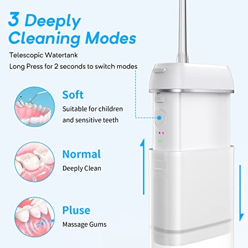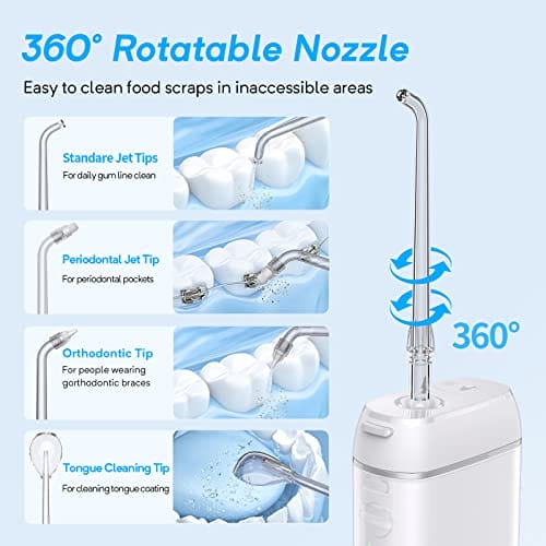 • 【Technologia impulsowa i głębokie czyszczenie】 Dental hydropulsor przyjmuje technologię nici dentystycznej i współpracuje z 3 trybami czyszczenia obszaru ust, którego nie można dotknąć tradycyjnymi szczoteczkami do zębów. Wylot ciśnienia wody jest regulowany w zakresie (30psi-140psi). Końcówki dysz obrotowych o 360° są zaprojektowane do czyszczenia zębów pod wieloma kątami i skutecznego rozwiązywania różnych problemów dentystycznych, takich jak krwawiące dziąsła, płytka nazębna, kamień nazębny itp.
