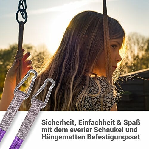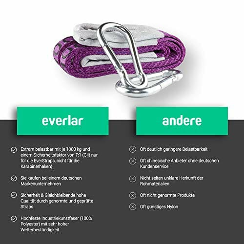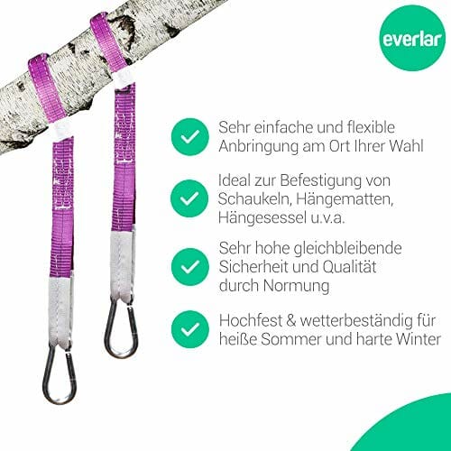 EverStraps I 2 x 1000kg 2m I Bardzo mocne mocowanie huśtawki, hamaka, wiszącego krzesła etc. W komplecie 2 karabinki I Wyjątkowo mocne, elastyczne, odporne na warunki atmosferyczne