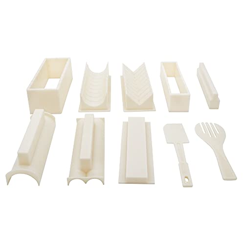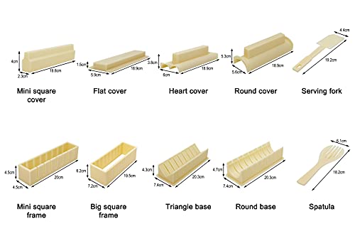 • Ten zestaw do sushi składa się z 10 części. Dostępnych jest 8 foremek, które umożliwiają łatwe sushi w 5 różnych kształtach – serce, okrągłe, piramidę, małe i duże kwadraty, duży widelec do ryżu i nieklejącą się szpatułkę kuchenną oraz podręcznik kolorów krok po kroku.