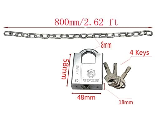 • Opakowanie zawiera: 1 x kłódka, 4 x klucz, 1 x twardy stalowy łańcuch m8 * 800 mm.