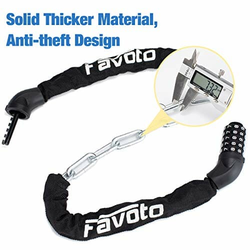 • 【5-cyfrowa kombinacja resetowalna】 – 5-cyfrowy zamek łańcuchowy firmy Favoto może zapewnić do 100 000 różnych kombinacji, co uniemożliwia odszyfrowanie. W szczególności blokadę łańcucha można zresetować, można zmienić kombinację zgodnie z własnymi życzeniami.