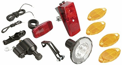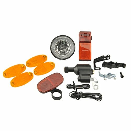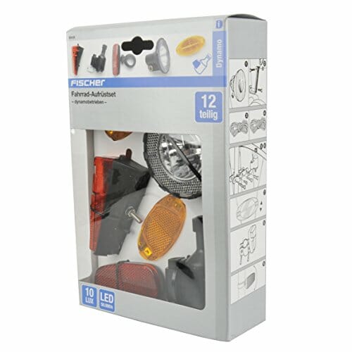 • Zawartość: zestaw obejmuje 1 reflektor przedni 10 luksów z reflektorem, 1 uchwyt na reflektor, 1 krótki kabel 2-żyłowy 1 długi kabel 2-żyłowy, 1 dynamo, 1 uniwersalny uchwyt dynamo, 1 tylne światło LED z reflektorem, 1 reflektor Z i 4 reflektory szprychowe