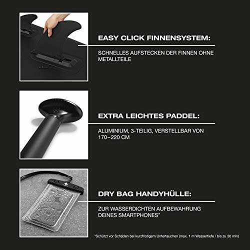 • Wiele dodatków: w zestawie etui ochronne na telefon komórkowy, pompka, uchwyt na kamerę sportową, pętla bezpieczeństwa, ręczna pompka powietrza, zestaw naprawczy, torba do przechowywania, 3 płetwy (2 małe, 1 duże), torba do noszenia, drybag może być używana jako boja do pływania.