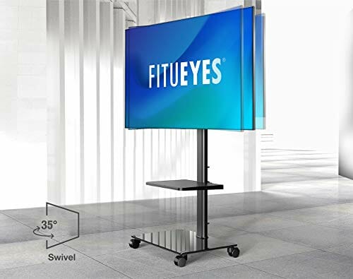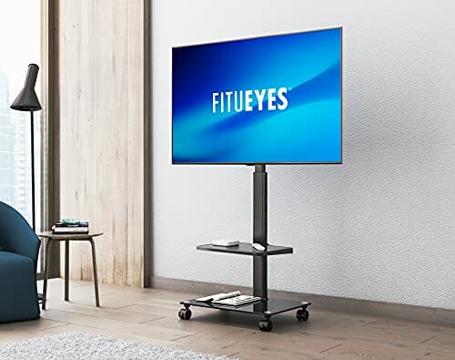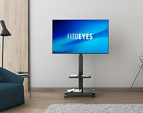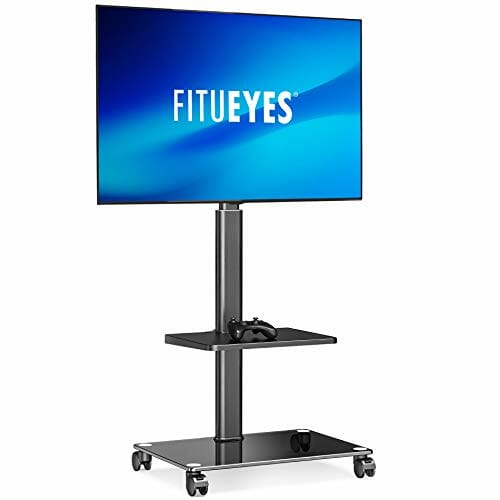 FITUEYES Stojak pod telewizor na kółkach do telewizorów od 32 do 60 cali, przenośny mobilny stojak na telewizor, obrotowy wózek na telewizor, regulacja wysokości, zdejmowana półka, czarny, łatwy montaż