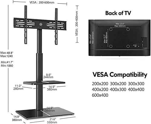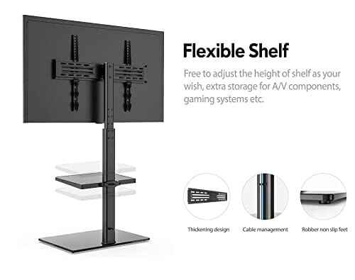 ✅ Wystarczająco dużo miejsca: Wystarczająco dużo miejsca – Stojak na telewizor ma 2 półki do przechowywania odtwarzaczy DVD/Bluray, kabli, konsoli do gier i innych akcesoriów audio. Mała półka jest wykonana z tworzywa sztucznego, a uchwyt można regulować.