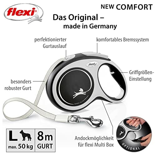 • Ten produkt zawiera 1 x Flexi – smycz na kółkach New Comfort Band – 8 metrów do 50 kg – czarna – 1 sztuka