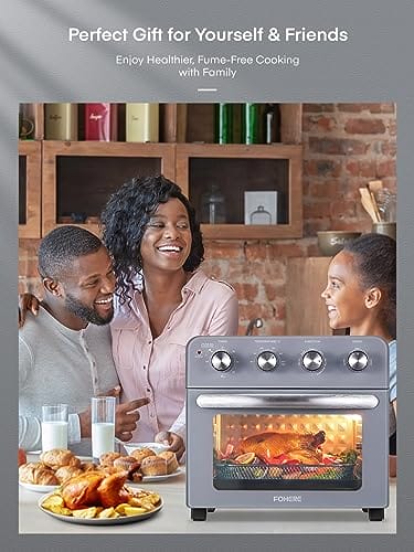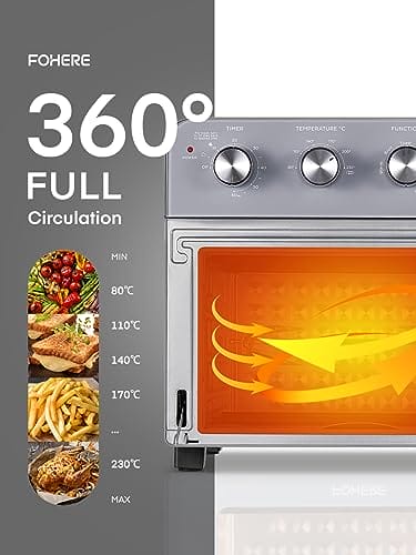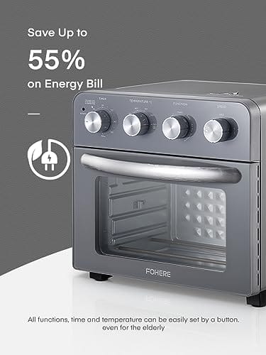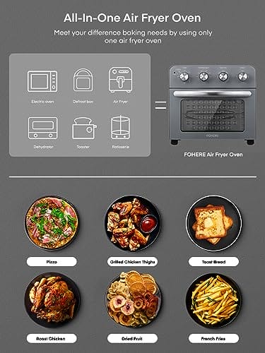 FOHERE Heißluftfritteuse mit Drehspieß 23L,1700W Heißluft-Backofen auf der Arbeitsplatte, Einfach zu Verwenden, Unabhängige Temperaturregelung zum Energiesparen, 6 Zubehörteile, Grau