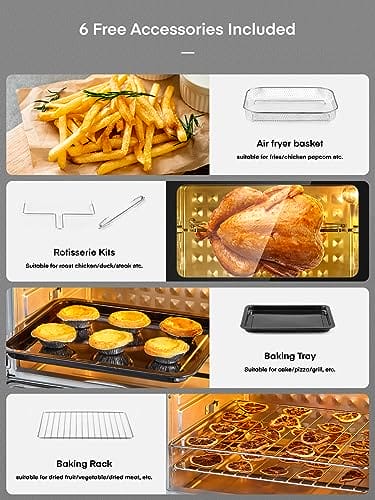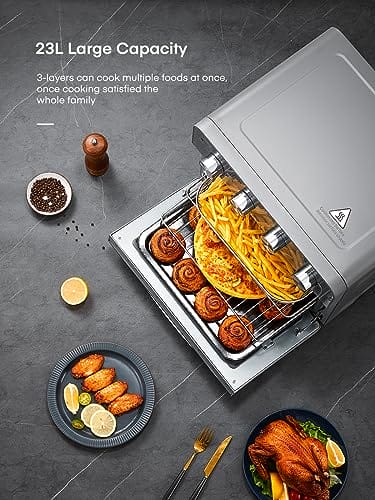 - 🍟【23L Großes Familienformat】 Das 23 l große fassungsvermögen bietet platz für 1–2 kg hähnchen, 18 eierkuchen, 16 hähnchenflügel, 25,4 cm pizza, 1,5 kg pommes frites und 12 toastscheiben. Das 3-schicht-design kann den Innenraum des toasters voll ausnutzen, mehrere lebensmittel gleichzeitig zubereiten und problemlos familienessen und partys abhalten.