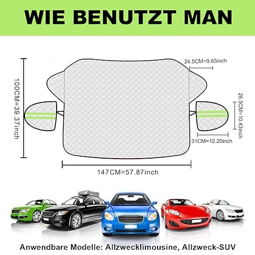 • 【Nadaje się do większości samochodów】Wymiary osłony szyby samochodowej 147 x 100 cm. Całkowita długość 197 x 100 cm z osłoną lusterka bocznego 31 x 26,5 cm. Pasuje do prawie wszystkich samochodów, w tym SUV-ów, i chroni Twój samochód przed mrozem i śniegiem. Przed zakupem należy zmierzyć pojazd, aby upewnić się, że pokrowiec będzie pasował.