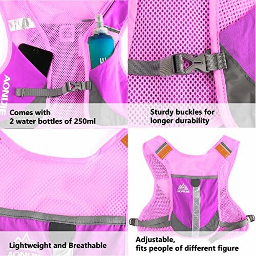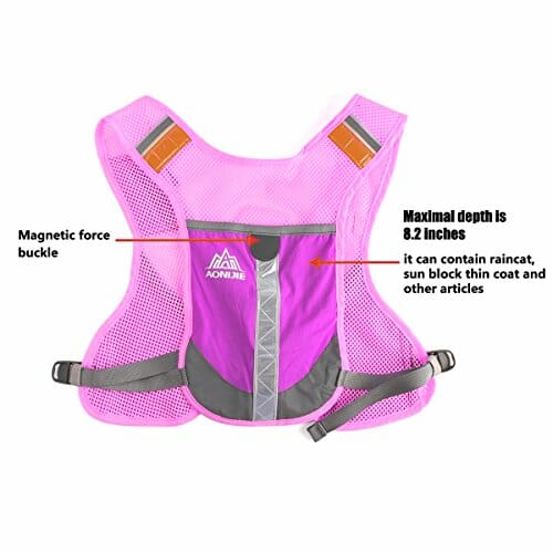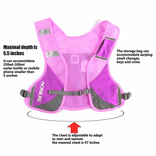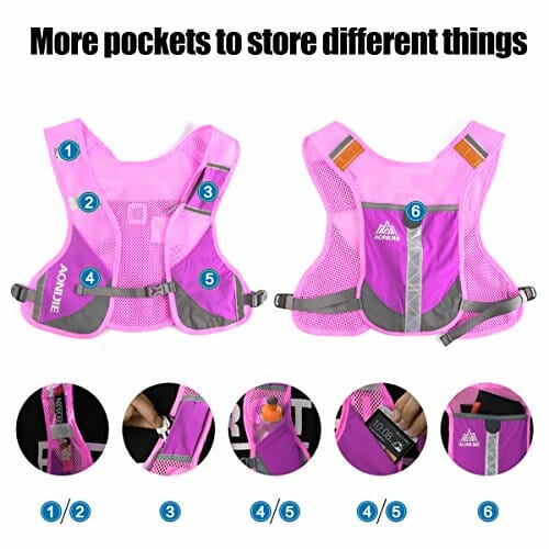 • Z przodu pakietu kamizelki znajdują się 2 małe kieszenie na małe przedmioty, takie jak przekąski, 1 średnia kieszeń z zamkiem błyskawicznym na pieniądze, klucze, monety i zatyczki do uszu oraz 2 duże kieszenie na butelki z wodą lub inne rzeczy mniejsze niż 13 cm. Z tyłu znajduje się również duża głębokość kieszeni 20 cm, do której można włożyć ręcznik lub płaszcz przeciwdeszczowy. Jest bardzo wygodna dla użytkowników.