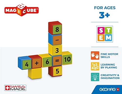• Pudełko zawiera asortyment elementów z liczbami, kropkami i symbolami, które mocują się do kostek za pomocą magnetyzmu oraz książeczkę z szablonami dla dzieci od 3 roku życia