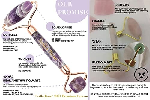 • Wysoka na każdy sposób 100% bez piszczenia, gładkie toczenie się do twarzy, luksusowy „dwustronny” oryginalny ametystowy wałek Uważaj na to, że kupujesz prawdziwy kwarc ametystowy, a nie tanie szkło lub plastik, które zawierają ostre chemikalia i mogą grzechotać i skrzypić. Nasz najlepszy wałek do ametystu zawiera dożywotnią gwarancję piszczącą i bezgrzechową.
