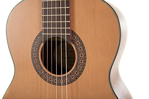 • Seitliche Griffbrettmarkierung am 3., 5. und 7. Bund, Holz-Schallloch-Mosaik