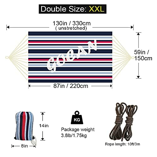 ✅ 【1】Bardzo duży hamak: 【1】Bardzo duży hamak dla 2 osób: w porównaniu z innymi hamakami dwuosobowymi ten jest zdecydowanie dłuższy i szerszy. Łóżko tego płóciennego hamaka ma wymiary 221 x 165 cm, całkowita długość wynosi 330 cm (nierozciągnięte) od pętli do pętli. Cały hamak osiągnie 3,4 m (liny drzewne nie wchodzą w zakr