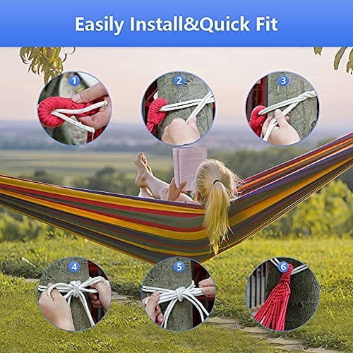 • Łatwy w konfiguracji】 Wystarczy kilka sekund, aby zamontować hamak wahadłowy. W zestawie 2 nylonowe pasy o dużej gęstości, przymocuj hamak do stojaka hamaka lub zawieś go między dwoma wałami. Możesz więc cieszyć się pięknem przyrody na świeżym powietrzu lub spokojną drzemką na podwórku lub w ogrodzie.