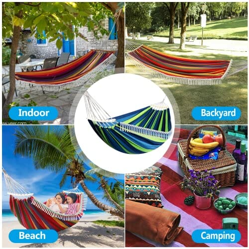 • 【Zastosowanie zewnętrzne i wewnętrzne】 Przenośny hamak jest lekki i łatwy do przechowywania, używany do kołysania, spania lub odpoczynku. Możesz zainstalować go na patio, ogrodzie, parku, werandzie lub zabrać go na kemping, wędrówki, bawić się na plaży, podróżować, opalać się, piknik itp. Używaj go w dowolnym miejscu wewnątrz lub na zewnątrz, to zależy od Ciebie. Świetny dodatek kempingowy i podróżny dla pary / rodziny.