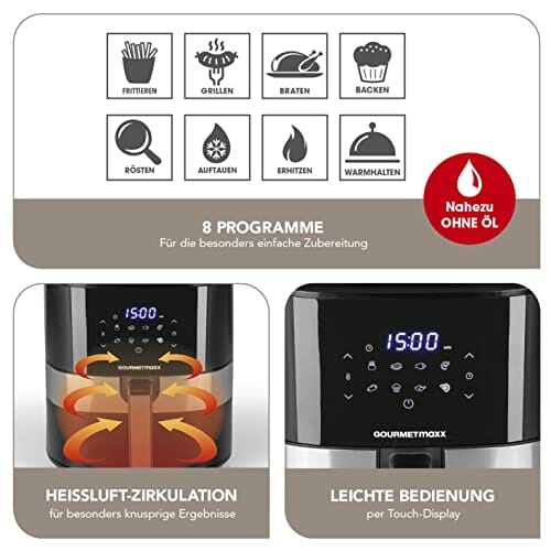 - FRITTEUSE OHNE ÖL: Die GOURMETmaxx Heißluftfritteuse macht es Ihnen möglich, besonders fettarm und schonend zu kochen. Sie hält konstant die gewählte Temperatur, sodass jedes Gericht per Timer perfekt und auf den Punkt zubereitet werden kann