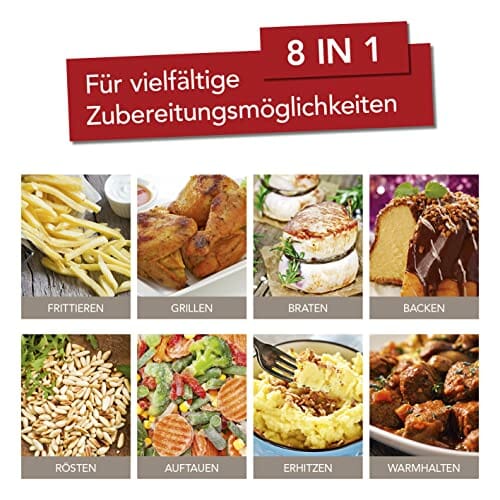 - UMFANGREICHE FUNKTIONEN: Die Heißluftfritteuse mit besonders großem Füllvolumen kombiniert einen Heißluftofen, einen Grill und eine Fritteuse. Ideal geeignet zum Frittieren, Grillen, Braten, Backen, Rösten, Auftauen, Erhitzen und Warmhalten