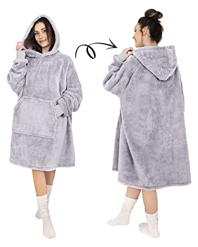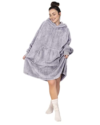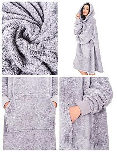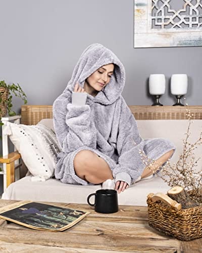 Gräfenstayn Puszysta bluza z kapturem Sherpa koc z rękawami i kapturem Öko-Tex Standard 100 nadający się do noszenia przytulny koc do zakładania ciepły przytulny sweter dla kobiet i mężczyzn (L – XL szary)