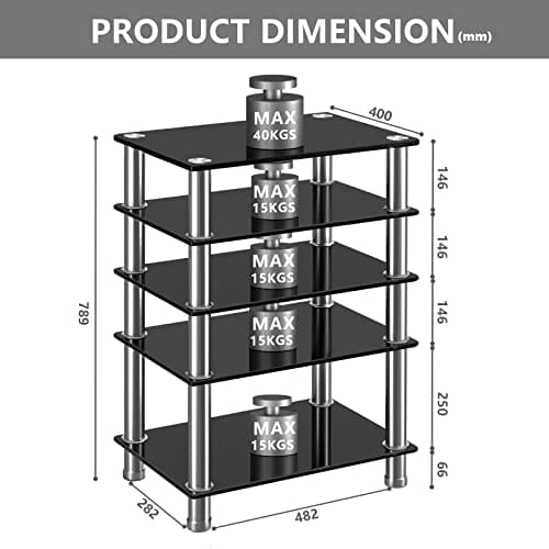 - 5 Ebenen Regal, schwarz gehärtetes Glas. Top Glas Kapazität 40 kg, andere Regale Kapazität 15 kg