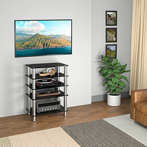 - Hohe Qualitätskontrolle, 5 Jahre Garantie inklusive. Dieses TV Hifi Rack ist leicht aufzubauen und sieht elegant aus. Lieferung beinhaltet Bedienungsanleitung und notwendige Schrauben, die eine vollständige Illustration für Montage bietet.