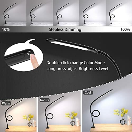Hokone Lampa biurkowa LED z łabędzia szyja, lampa zaciskowa, ramię obrotowe, lampa architektoniczna, ściemnianie, regulowana temperatura barwowa, ochrona oczu, sterowanie dotykowe, lampa stołowa biurowa, 9 W, czarna