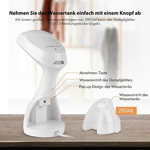 • 【Szybkie ciepło i wydajna energia】 Dzięki wysokiej mocy 1500 W parownica HOMEASY oferuje parę w mniej niż 25 sekund. Zbiornik na wodę o pojemności 280 ml zapewnia ciągłą parę do 15 minut. Nie trzeba często napełniać wody. Prasować odzież na raz na raz. Krótszy czas oczekiwania, dłuższy czas użytkowania.