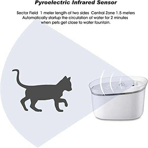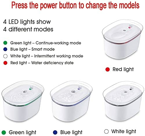 • Wbudowane 3 tryby pracy: tryb indukcji podczerwieni, tryb ciągły i tryb okresowy. Naciśnij przycisk zasilania, aby zmienić tryb pracy. W trybie indukcji podczerwieni fontanna dozuje wodę, gdy czujnik podczerwieni wykryje zwierzęta w odległości 1,5 metra; w trybie ciągłym fontanna dozuje wodę przez 24 godziny; w trybie przerywanym, woda cyrkuluje przez 1 godzinę i wyłącza się na 30 minut. Wszystko zaprojektowane dla niskoemisyjnych i przyjaznych dla środowiska.