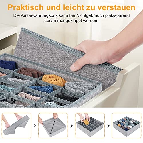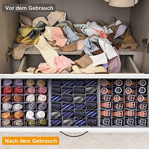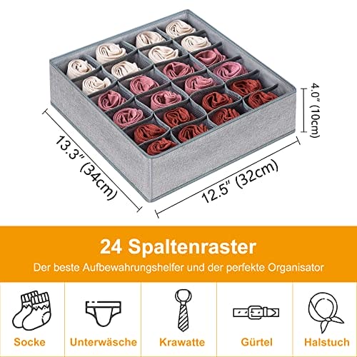 • Idealne narzędzie do przechowywania – wymiary wielofunkcyjnego pudełka do przechowywania wynoszą 34 x 32 x 10 cm. Przed zakupem należy zmierzyć rozmiar szuflady. Jest podzielony na 24 przegródki, w których można przechowywać skarpety, bieliznę itd. Przestrzeń jest niezależna i nie przeszkadza wzajemnie.