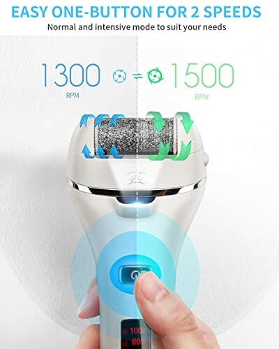 Dwa tryby prędkości: Dwa tryby prędkości z blokadą bezpieczeństwa: Elektryczny pilnik do stóp ma niską prędkość 1700x/min używany do delikatniejszej pielęgnacji skóry i dużą prędkość 2000x/min używany do usuwania uporczywej, grubej i martwej skóry. Dwie prędkości można dowolnie przełączać za pomocą przycisku zasilania.