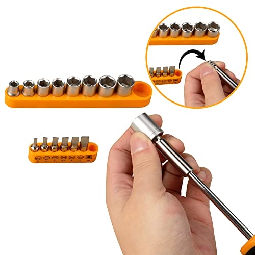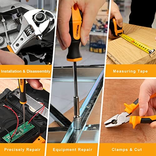 • Zawiera szczypce kombi, śrubokręt precyzyjny, szczypce, klucz imbusowy, szczypce ukośne, ostrza noża, śrubokręt, taśmę mierniczą, uchwyt sterownika, klucz nastawny i klucz nasadowy