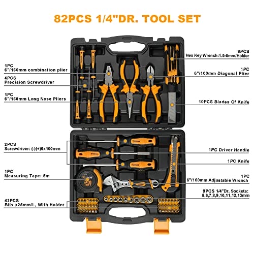 • 82-częściowy zestaw narzędzi ze wszystkimi ważnymi narzędziami dla majsterkowiczów i mechaników