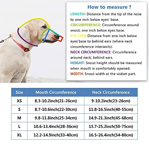 • WYMIARY: Zmierz obwód pyska i szyi psa. Następnie zapoznaj się z tabelą rozmiarów i wybierz odpowiednią wielkość. Jeśli wahasz się między dwoma rozmiarami, bardziej odpowiedni będzie mniejszy. Przed zakupem prosimy upewnić się co do wybranej wielkości.