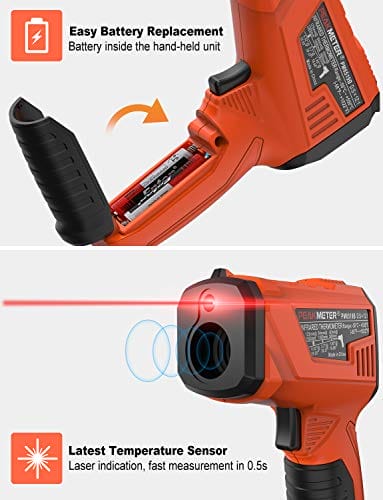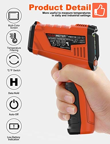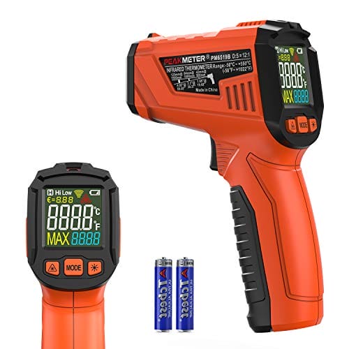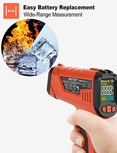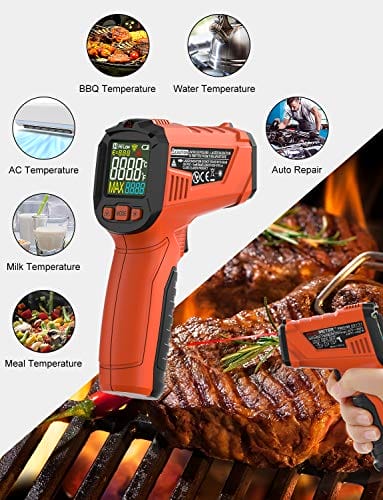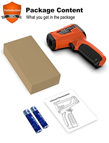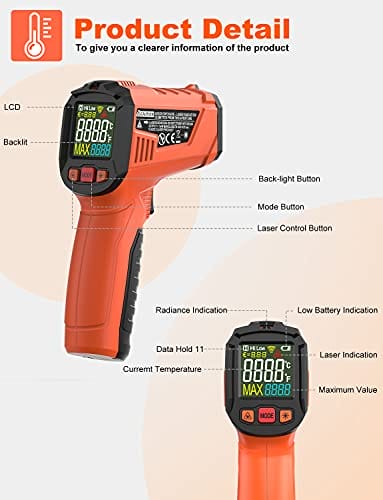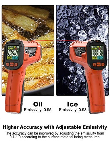 Cyfrowy termometr podczerwieni bezdotykowy z laserowym wyświetlaczem kolorowym -58℉~1022℉(-50℃~550℃) z regulowaną emisyjnością, idealny do kuchni i zastosowań przemysłowych (nie do pomiaru temperatury ciała). Precyzyjny i łatwy w użyciu. Odpowiedni do gotowania i monitorowania temperatury w różnych branżach. Zapewnia szybki i dokładny odczyt temperatury bez konieczności kontaktu. Doskonały dla profesjonalistów i amatorów. Wykorzystaj nasz cyfrowy termometr podczerwieni, aby kontrolować temperaturę w sposób bezpieczny i wygodny.