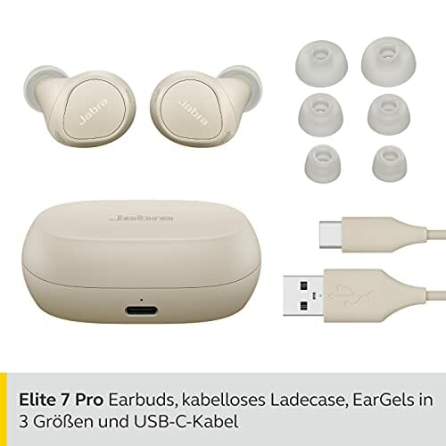 • Lieferumfang: 1x Jabra Elite 7 Pro In-Ear-Kopfhörer, Ladeetui, EarGels in 3 Größen, USB-C-Kabel, 5,4 g, Gold Beige, in praktischem „Frustration-Free Packaging”: nachhaltige, verpackungsmüllarme Box