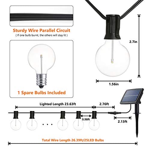 Joomer Lampy solarne 8 m, do ogrodu, 25 + 1 LED G40, nietłukące się żarówki, wiszące lampy ogrodowe, zasilane energią słoneczną, 4 tryby, na zewnątrz, solarne łańcuchy świetlne, wodoodporne, na taras,