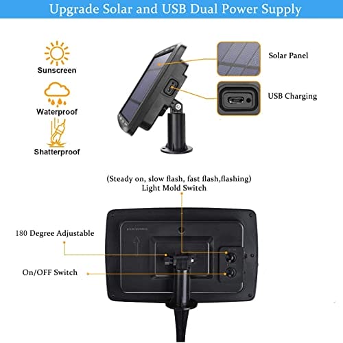 • Podwójne zasilanie słoneczne i USB Solarne łańcuchy świetlne zostały zaprojektowane specjalnie z podwójnym zasilaniem. Można go ładować za pomocą kolektorów słonecznych przez 8 godzin w słoneczne dni. Można również ładować za pomocą mikro złącza USB przez około 4 godziny, gdy pogoda nie jest dobra, co umożliwia korzystanie z niego w dowolnym miejscu
