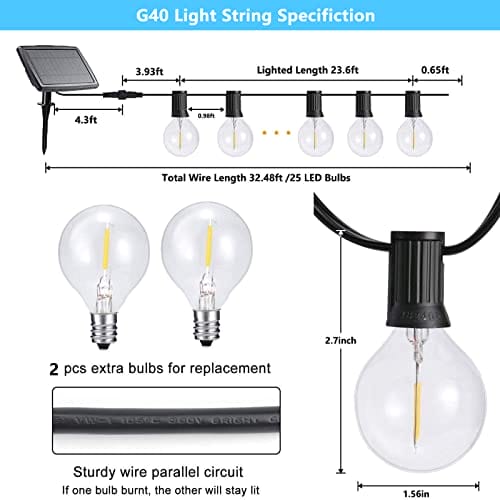 Joomer Solarny łańcuch świetlny do użytku na zewnątrz,9,9m,25 szt.+1 szt.,G40,do użytku na zewnątrz,4 tryby pracy,odporny na działanie warunków atmosferycznych,ciepła biel