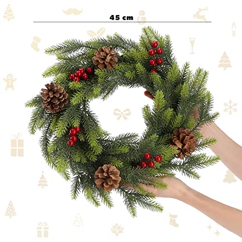 • Wieniec bożonarodzeniowy jak prawdziwy – ta dekoracja bożonarodzeniowa o średnicy 45 cm jest wykonana z tworzywa sztucznego, mimo że trudno w to uwierzyć. Sztuczny wieniec bożonarodzeniowy charakteryzuje się tak wysoką jakością, że prawie nie różni się od prawdziwego wieńca.