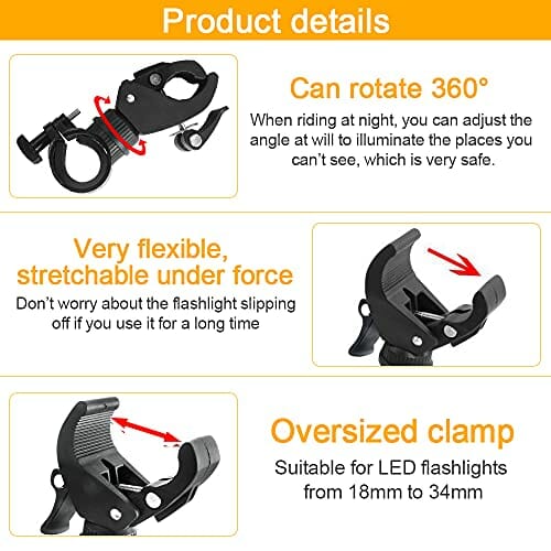 • Dobry pomocnik dla rowerzystów: Średnica zacisku w górnej części uchwytu na światło rowerowe wynosi: 1,8-3,5 cm, który nadaje się do kierownicy rowerowej o średnicy 20-35 mm. Może być używany nie tylko do latarek LED, ale także do mocowania sprzętu nawigacyjnego lub głośników. Średnica mocowania na spodzie wynosi: 2-3,5 cm, odpowiednia do latarek od 18 mm do 34 mm.