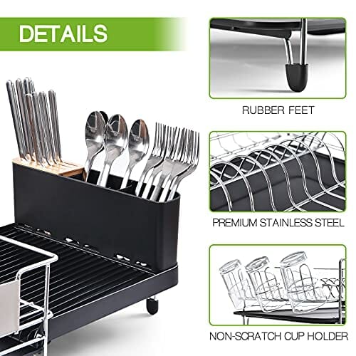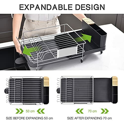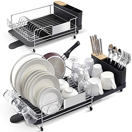 Kingrack Ociekacz do naczyń, stojak do suszenia naczyń ze stali nierdzewnej, rozszerzalny ociekacz do naczyń kuchennych, stojak na naczynia o dużej pojemności z obrotową wylewką 360, czarny WKUK810439.