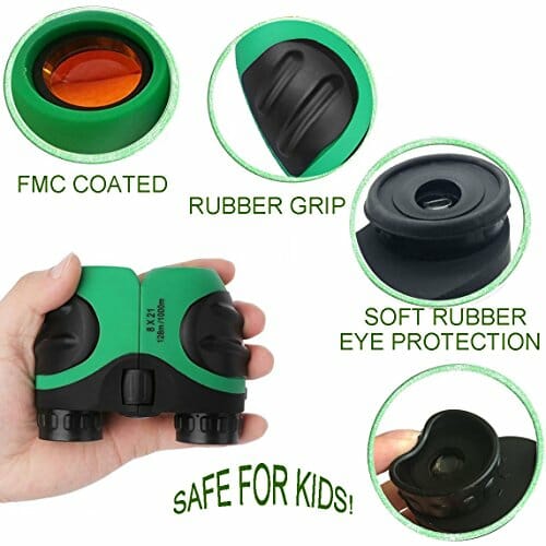 • NAJWYŻSZA KONSTRUKCJA – Antypoślizgowe zarysowania, uchwyt został ergonomicznie opatentowany, dzięki czemu gumowane uchwyty są idealne dla małych dłoni, lornetka jest łatwa do skupienia i można ją regulować, aby łatwo dopasować do luki w odległość oczu, zapewniając małym poszukiwaczom przygód bliższy widok na naturę! Liście drzewa oddalonego o 100 jardów zyskały ostry ostrość.