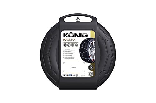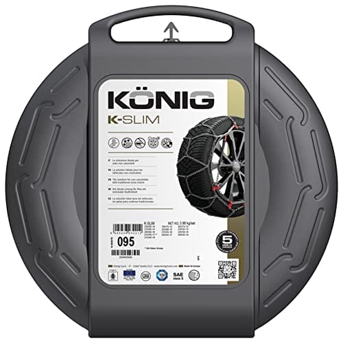 König K-Slim 100 – Łańcuchy śniegowe 2 sztuki, 215/70-14, 195/80-15, 215/70-15, 225/65-15, 235/60-15, 215/60-16, 225/55-16, 235/50-16, 245/45-16, 215/50-17 (Kleber Krisalp), 215/55-17, 225/50-17, 235/45-17, 225/45-18, 235/40-18, 235/35-19, Łańcuchy zimowe z ograniczoną podniesieniem podczas jazdy, kompatybilne z samochodami o ograniczonej przestrzeni w nadkolach, polecane przez producentów samochodów, ręczny system napinający, nylonowe zderzaki chroniące felgi aluminiowe, opatentowany system mikroregulacji, homologacje Ö-Norm 5117, UNI 11313, TÜV