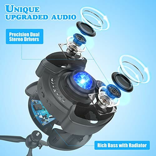 • 【Podwójny dźwięk przestrzenny】: podwójne urządzenia audio sprawiają, że efekt dźwiękowy jest bardziej trójwymiarowy. Wykorzystaj najbardziej zaawansowaną technologię Bluetooth 5.0, szybką prędkość połączenia i stabilną transmisję. Możesz ustawić głośność i zmieniać utwory za pomocą telefonu komórkowego. Można również wybrać gniazdo USB do odtwarzania muzyki.