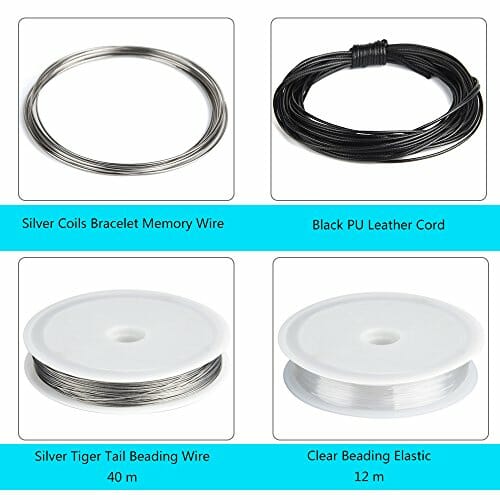 • 4 rodzaje drutów do koralików: czarny woskowany sznurek nylonowy, rolka srebrnego drutu tygrysi ogon do koralików, rolka z przezroczystej gumy perłowej, elastyczny drut na szpuli na bransoletki.
